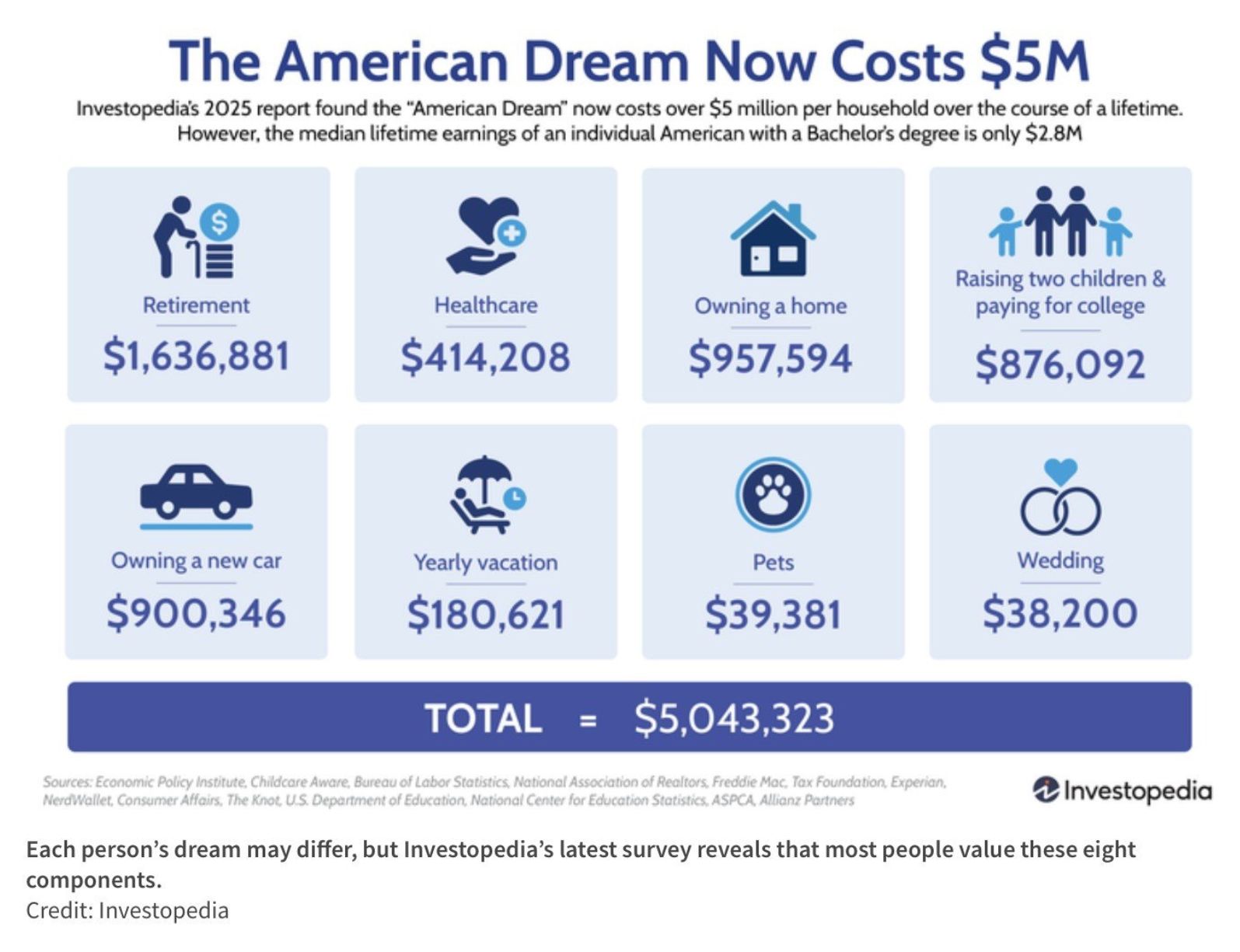 Here in American the Dream is fully under attack. By one estimate it costs as much as $5M to achieve the standard vision: